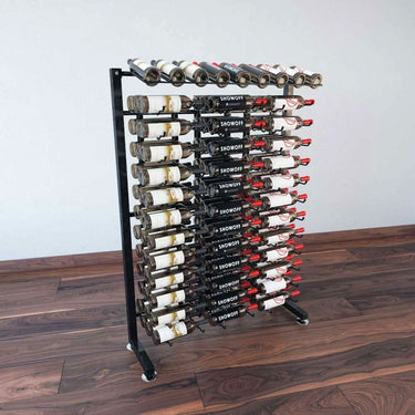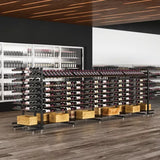 This one-sided version of the IDR4 shows off, label-forward, 117 bottles in a medium-sized space. Perfect for floor spaces with a wall backing, this IDR stands less than 5-feet in height, and highlights 9 bottles in presentation form, while showcasing dozens more bottles on our patented steel wine cradles below.