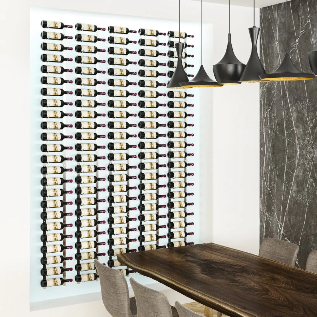 The W Series 8 is a 24-bottle tall, wall mounted wine rack that opens any wall to modern, label-forward design. Eight-feet tall and available in three bottle depths, our metal wine rack is perfect for collectors who have ample space and plenty of wine bottles to show off. This package includes a combination of two W Series wine racks that can be connected with supplied couplers for a compact, seamless column. Our W Series wall mounted wine racks are stackable (using supplied couplers) and may be cut, allowing multiple configurations for any wine room project.