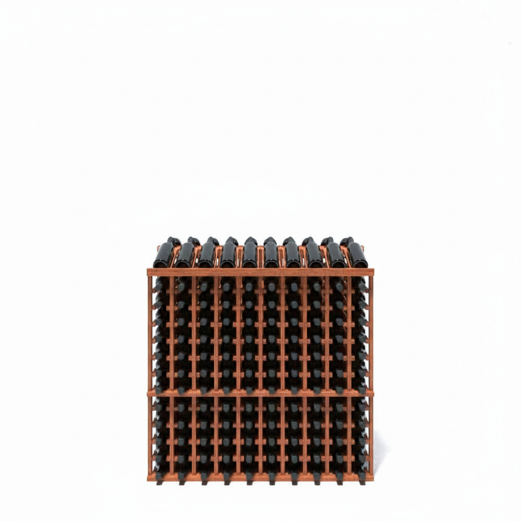 Two-sided retail wine merchandiser. Display 20 bottles with storage for 11 bottles underneath in each column.