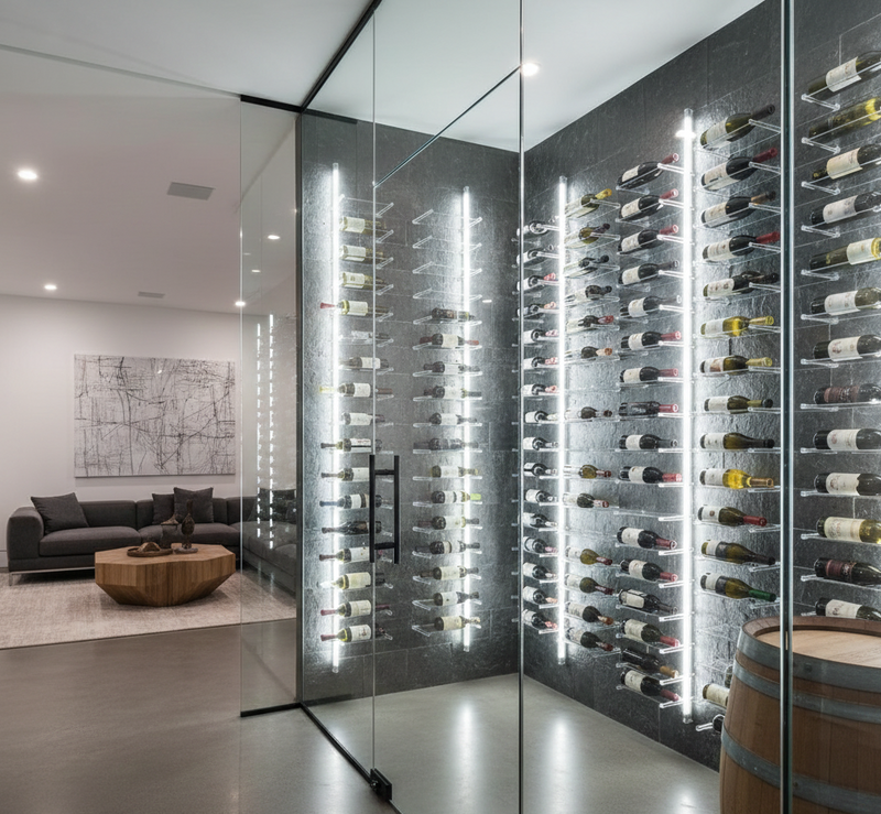 LED lighting, glass enclosures, and metal wine racks create dramatic focal points while protecting wine from UV exposure.