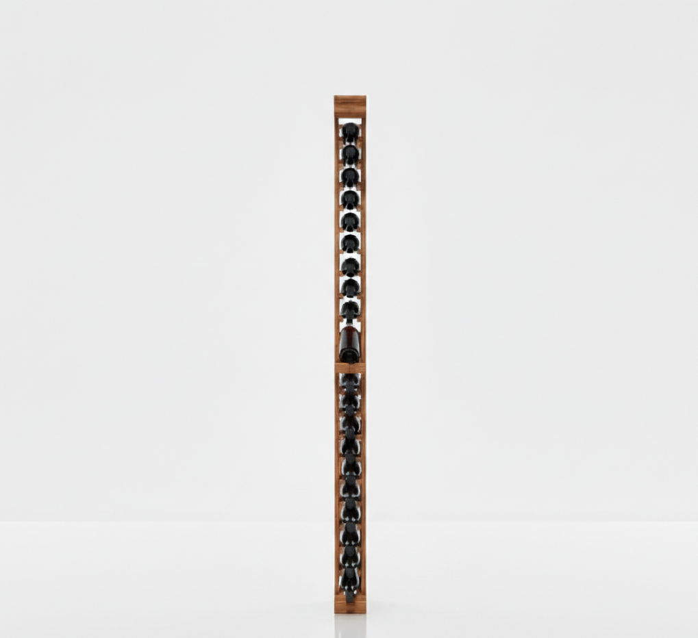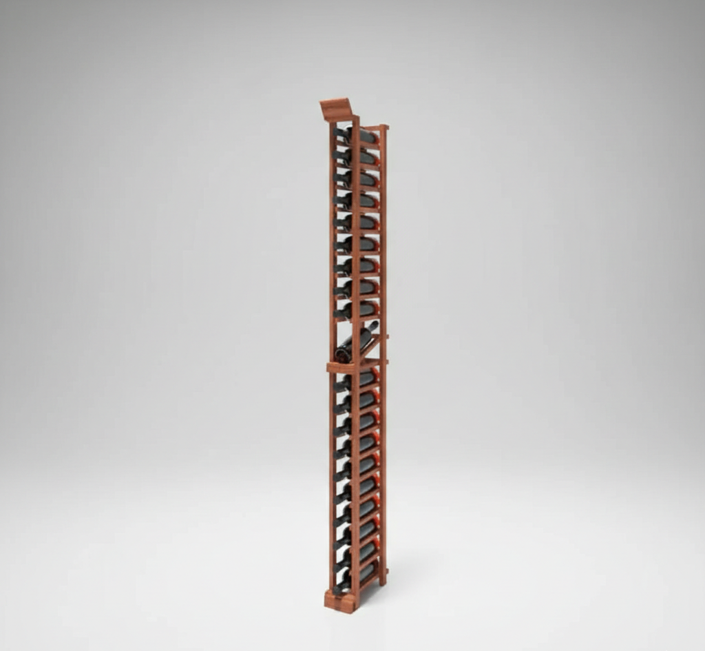 Elevate your wine collection with our meticulously designed 1 Column - 20 Bottle 7ft Wine Rack Kit with Display, crafted to seamlessly blend functionality with elegance. Featuring a display row for showcasing wine labels and including both Base Rack and Upper Rack components, it's the ideal choice for stylishly organizing and displaying your prized wine collection. Discover a sophisticated storage solution that enhances both home décor and wine appreciation. As your wine collection grows, so can your storage. Each kit securely holds up to 20 champagne-size 750ml bottles, ensuring your wines are stored safely and efficiently. Image shows Crown Molding & Toe Kick (sold separately). Available in Pine, Oak, Red Grandis, Mahogany, and Black Walnut and 5 Finish Options: Unfinished, Clear, Castle Brown, Charcoal & Gray.