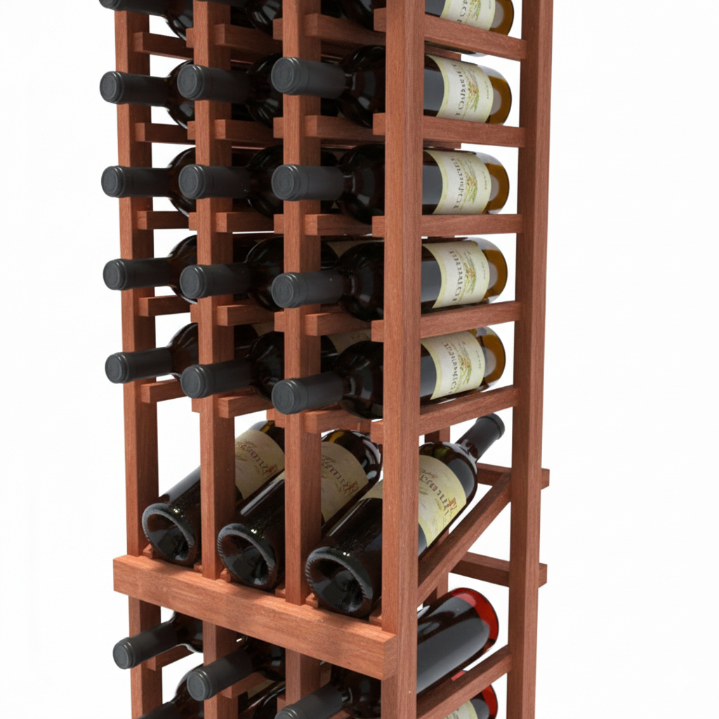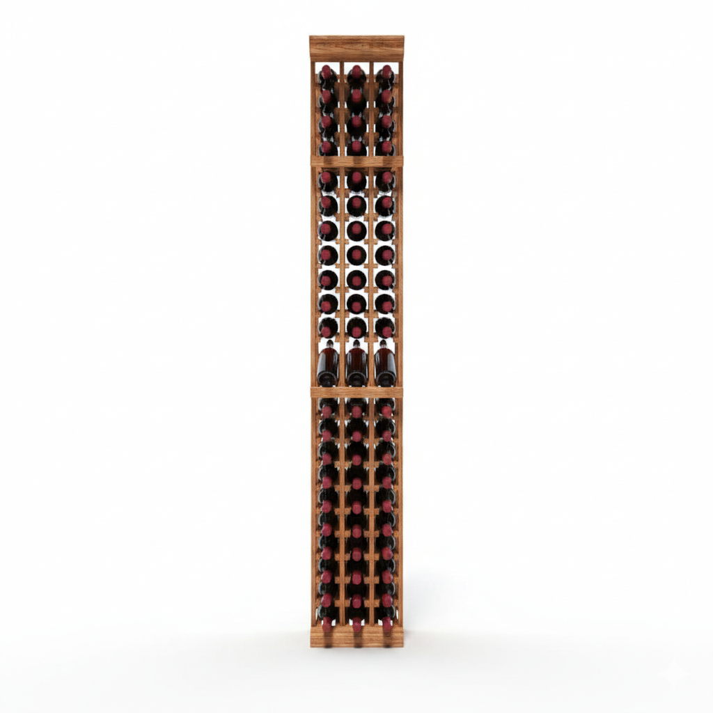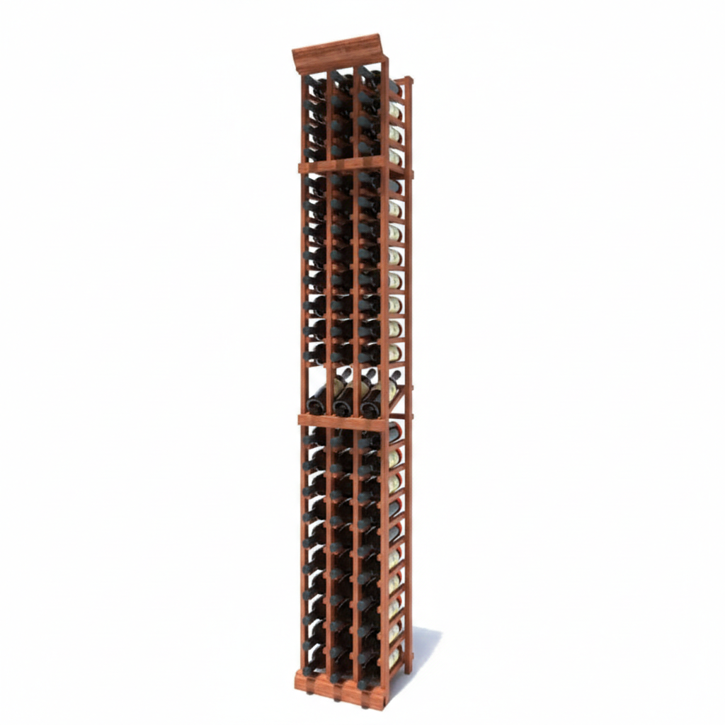 Elevate your wine collection with our meticulously designed 3 Column 69 Bottle 8ft Wine Rack Kit with Display, crafted to blend functionality with elegance seamlessly. Featuring a display row for showcasing wine labels and including both Base Rack and Upper Rack components, it's the ideal choice for stylishly organizing and displaying your prized wine collection. Discover a sophisticated storage solution that enhances both home décor and wine appreciation. As your wine collection grows, so can your storage. Each kit securely holds up to 69 champagne-size, 750ml bottles, ensuring your wines are stored safely and efficiently. Image shows Crown Molding & Toe Kick (sold separately). Available in Pine, Oak, Red Grandis, Mahogany, and Black Walnut and 5 Finish Options: Unfinished, Clear, Castle Brown, Charcoal & Gray.