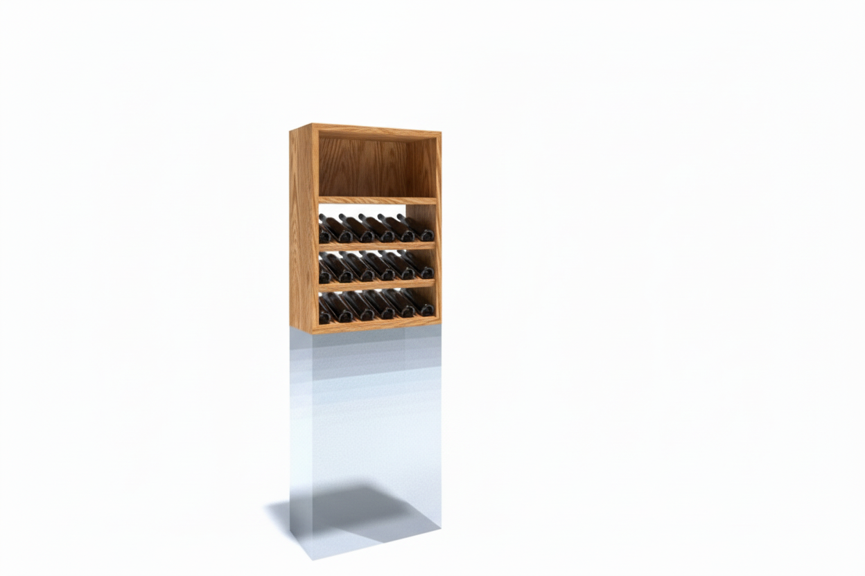 This 18-bottle display rack combines functional wine storage with architectural appeal. Constructed from wood veneer plywood, it accommodates standard 750ml bottles across six columns and stands 38.25 inches tall by 27.75 inches wide. Select from four wood species and five stain or finish options to match your décor—stain samples available upon request. The modular design allows standalone use or stacking atop a base rack for expanded capacity. Assembly is straightforward with included hardware and instructions. Wall mounting is recommended for stability, though fasteners must be sourced separately. An elegant solution for serious collectors seeking both display and organization.