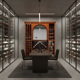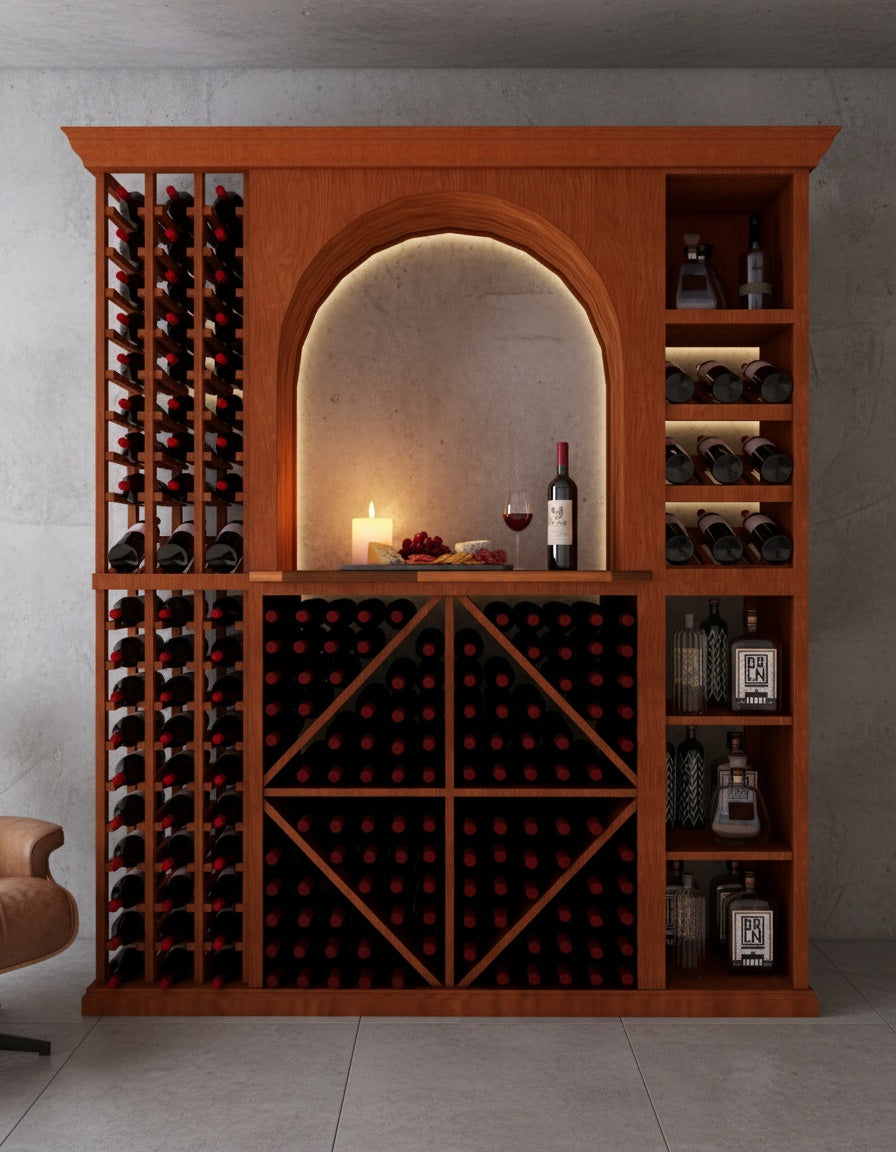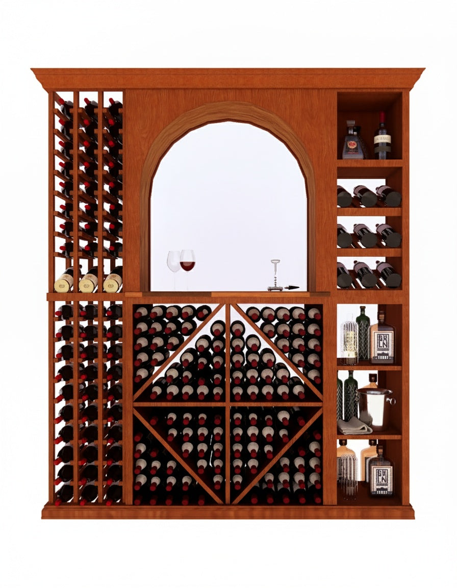 Elevate your home wine cellar with our 6 Foot Wine Cellar, holding up to 198 (750 ml) bottles. Part of the RediCellar collection, this luxury wine storage solution offers elegance and functionality, perfect for growing wine collections. Features individual bottle storage with display rows and shelves to showcase labels, a tasting table with a curved arch and versatile diamond bins for various wine and liquor sizes, perfect for home bars. Customize the finish and design to seamlessly fit your space and showcase your bottles in style.