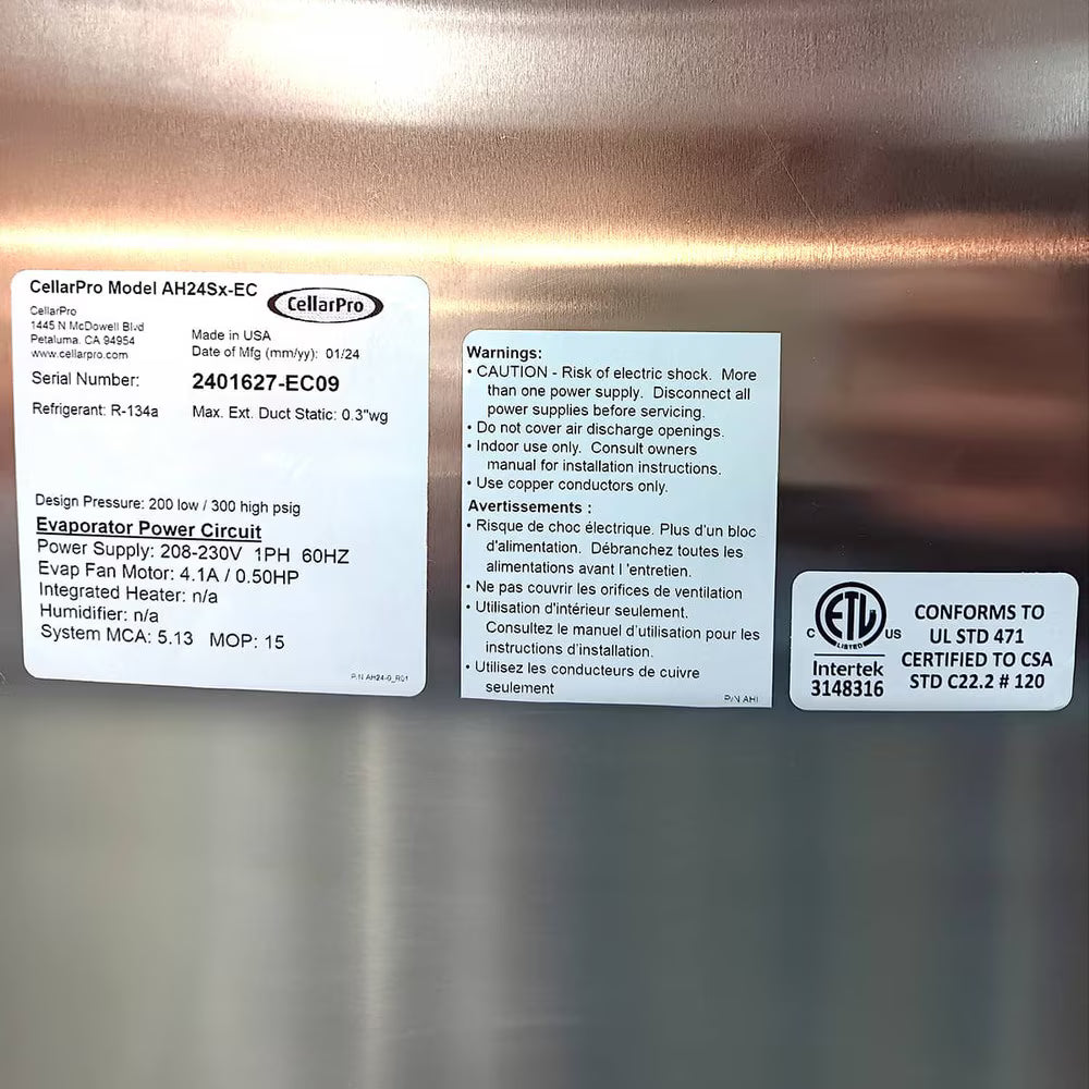 CellarPro AH24Sx-EC Air Handler Cooling System (P/N 32033). Our Split Air Handler is rated for exterior usage and designed for cellars up to 8000* cubic feet, providing ducted refrigeration specifically designed for wine cellars.