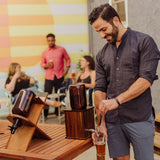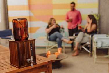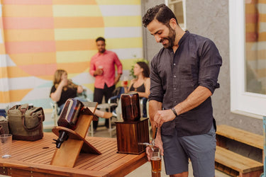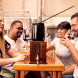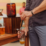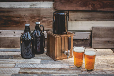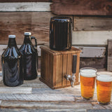 What's better than a freshly filled growler with your favorite brew? Your own personal Growler Tap to perfectly pour glass after glass, that's what. This innovative growler stand dispenses your beverage of choice from a 64-oz. growler (included) made of acacia and amber glass, and features a beer tap with removable handle and chalkboard surface to label your growlers brew. Now that sounds like the makings of a party! Made of acacia and amber glass.