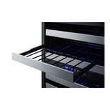 Inside, the ALWC532PNR is designed to store up to 46 standard Bordeaux style bottles, or a combination of 30 Bordeaux and 16 wider Burgundy bottles. The digital control panel allows you to manage the upper temperature chamber between 41 and 50 degrees F for white wine, while the lower zone is designed to store red wine between 50 and 64 degrees F. Six full-extension black wire shelves with stainless steel front trim move out smoothly on ball-bearing glides for easy loading. Both compartments include recessed LED lighting in a gentle blue hue for an attractive and efficient presentation.