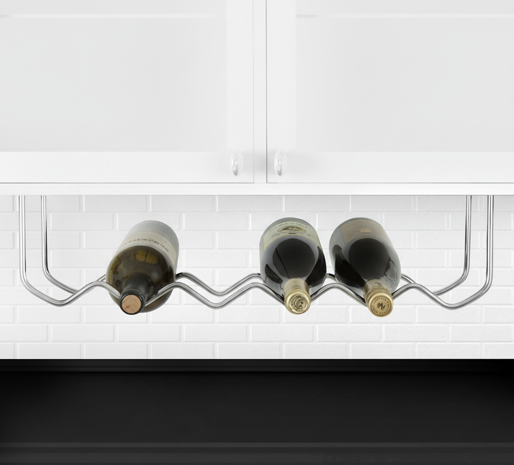 Perfect for small spaces, this under-cabinet rack frees up counter space and shows off favorite wines. The easy-to-install rack holds up to six bottles and folds flat for easy storage.