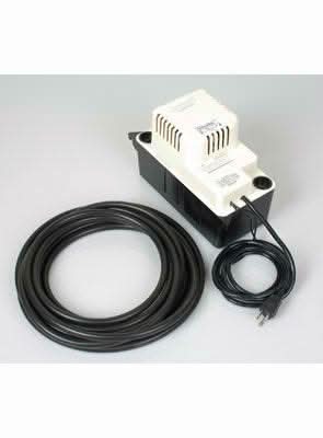 The condensate pump kit is designed as an automatic condensate removal pump for water dripping out of our cooling units' drain line. The pump is controlled by a float/switch mechanism that turns the pump on when approximately 2-1/4” of water collects in the tank, and automatically switches off when the tank drains to approximately 1-1/4”. The condensate pump kit allows the excess condensate to be pumped up to 20ft away from the unit.